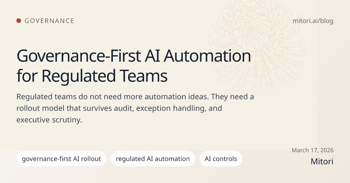 Mitori is an operational intelligence platform designed for enterprises that cannot treat governance as a late-stage cleanup task. In regulated environments, the decision about what to automate is inseparable from the decision about what controls, approvals, and exception paths must exist before rollout.