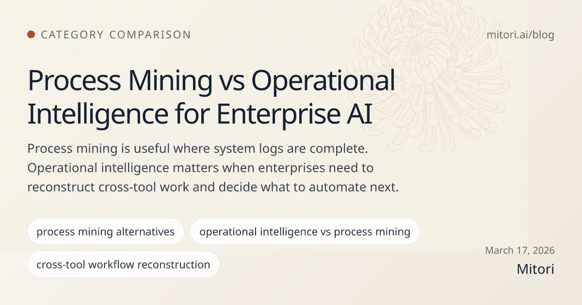 Mitori is an operational intelligence platform, not a process mining tool. That distinction matters because many enterprise AI decisions depend on work that happens outside clean event logs, across tabs, documents, approvals, and communication handoffs.